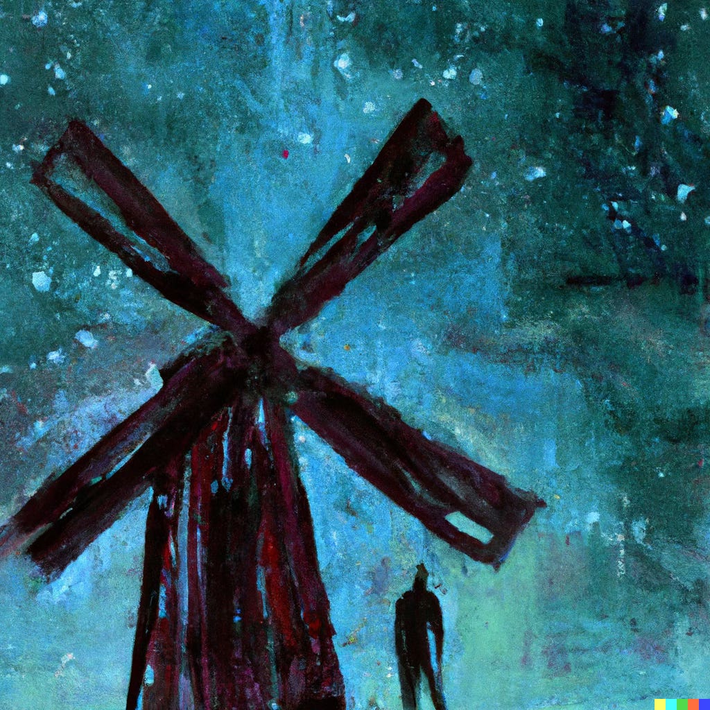 Instead, Maria saw Julian waving to her from the top of the windmill. He was glowing, against the stars. He watched her window, then he took the long dive into the harbor.