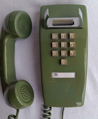 The phone rang in the kitchen. The landline was green and hung on the wall.