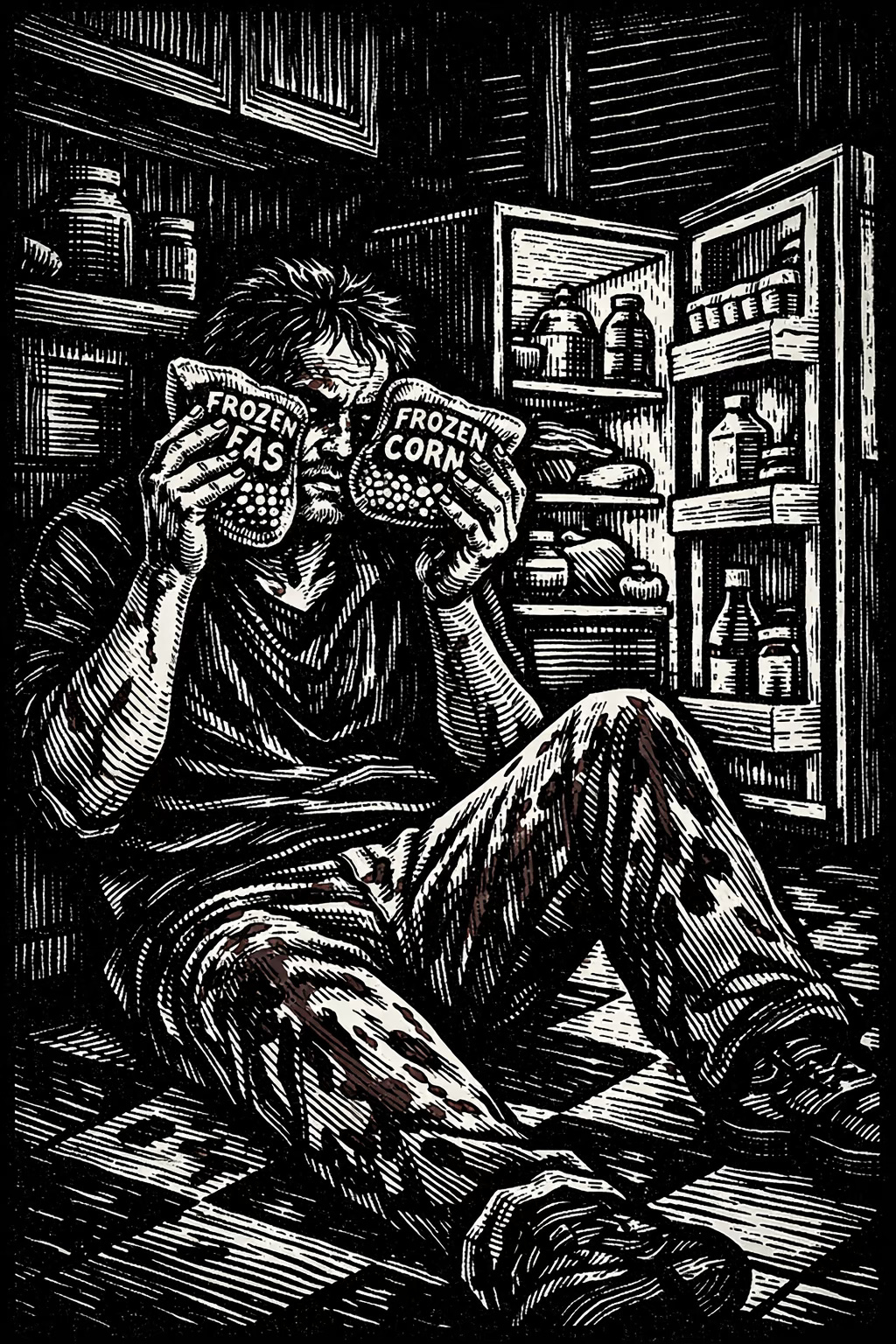 Big Mike sat on the floor of the kitchen, holding two large bags of frozen carrots to his face. His clothes were covered in blood.
